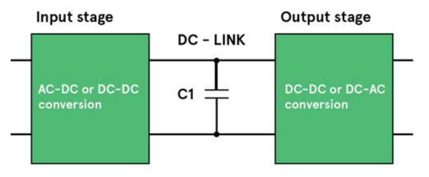 In a power inverter, a DC link capacitor is placed in parallel with the input to minimize the effects of voltage variations as the load changes